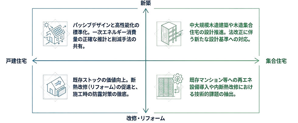 TBNは特定の領域に偏ることなく、省エネ・高気密化に向けた「すべての住宅形態」において網羅的に意見交換をしています。